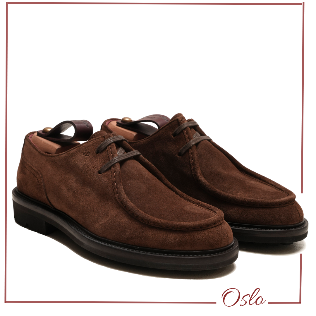 OSLO è la stringata in pelle di vitello che con le sue forme non convenzionali sono riconoscibili ovunque, amabilmente espresse dalle cuciture artigianali sulla punta, montata su un robusto e leggero fondo roccia in gomma VIBRAM.