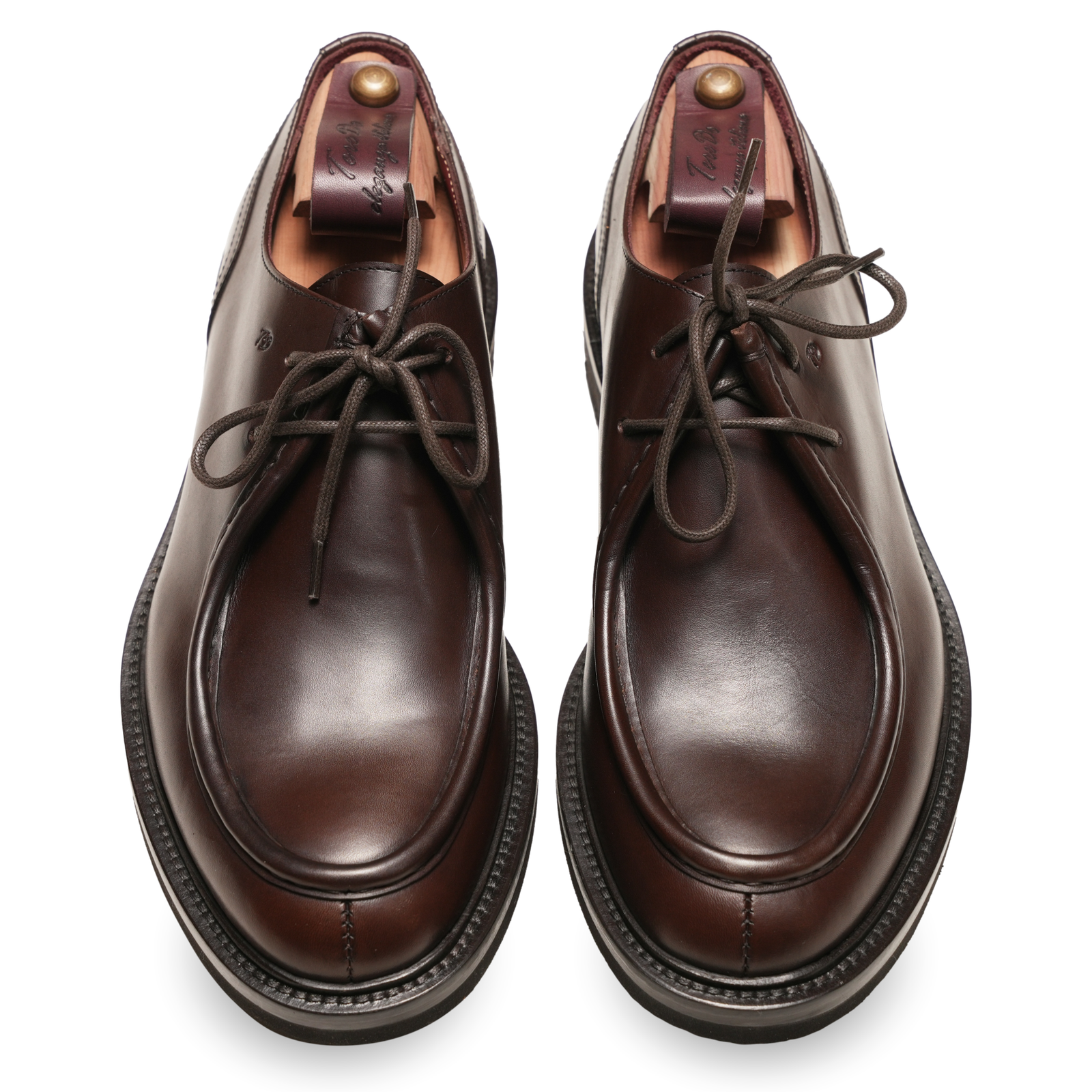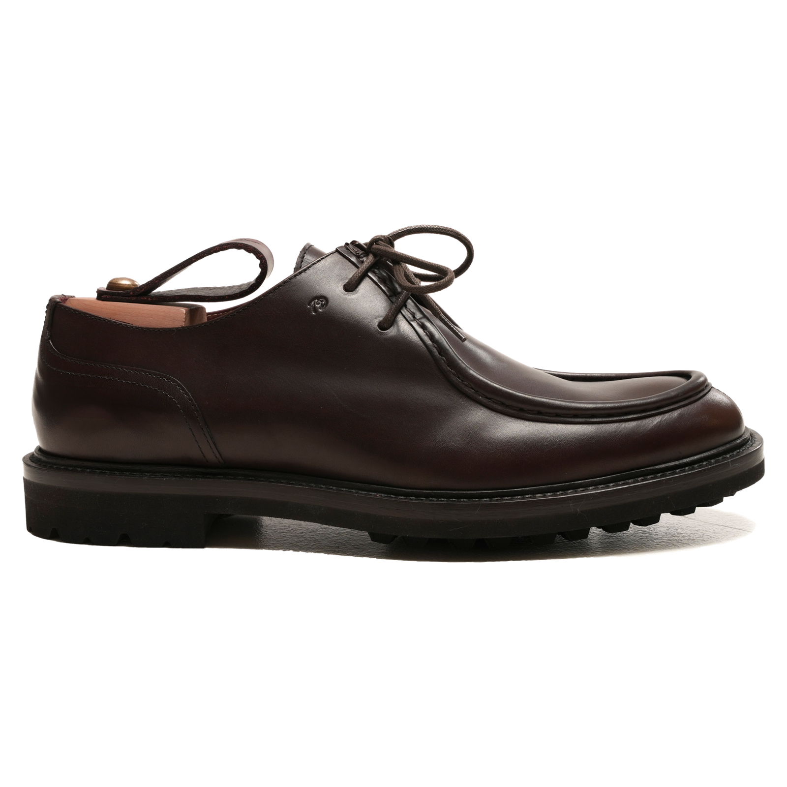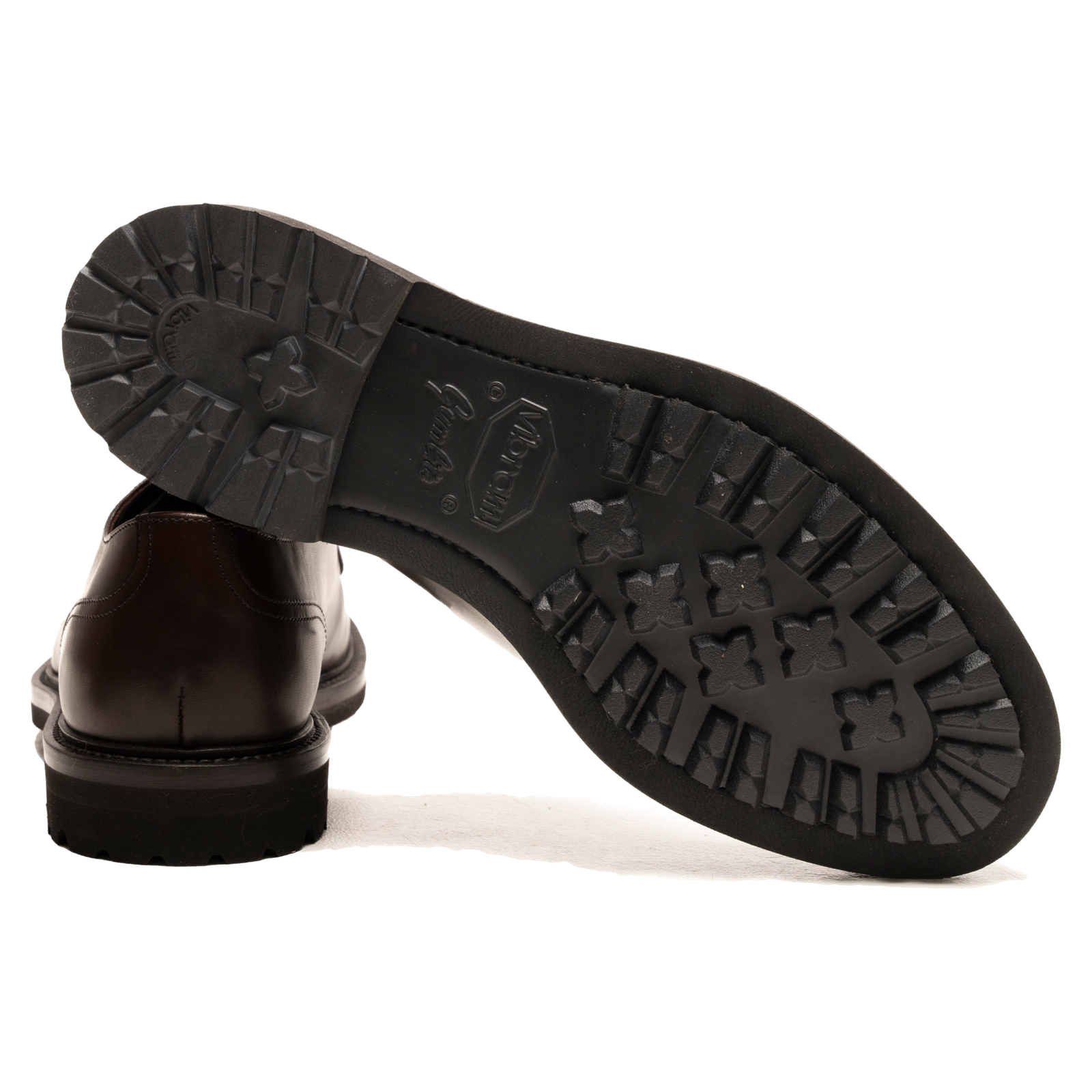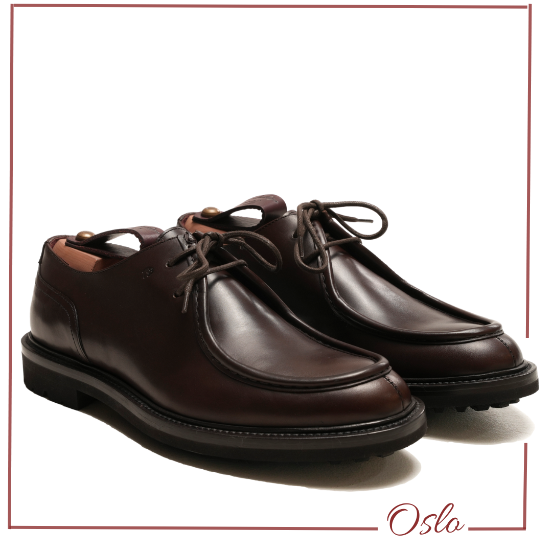 OSLO è la stringata in pelle di vitello che con le sue forme non convenzionali sono riconoscibili ovunque, amabilmente espresse dalle cuciture artigianali sulla punta, montata su un robusto e leggero fondo roccia in gomma VIBRAM.